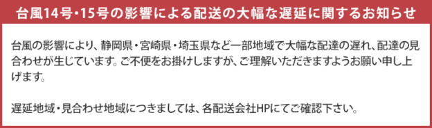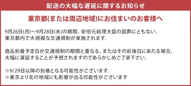 国葬にともなう配送日数の大幅な遅延に関するお知らせ(東京)
