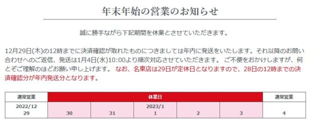 休業期間: 2022年12月30日(金)~2023年1月3日(火)